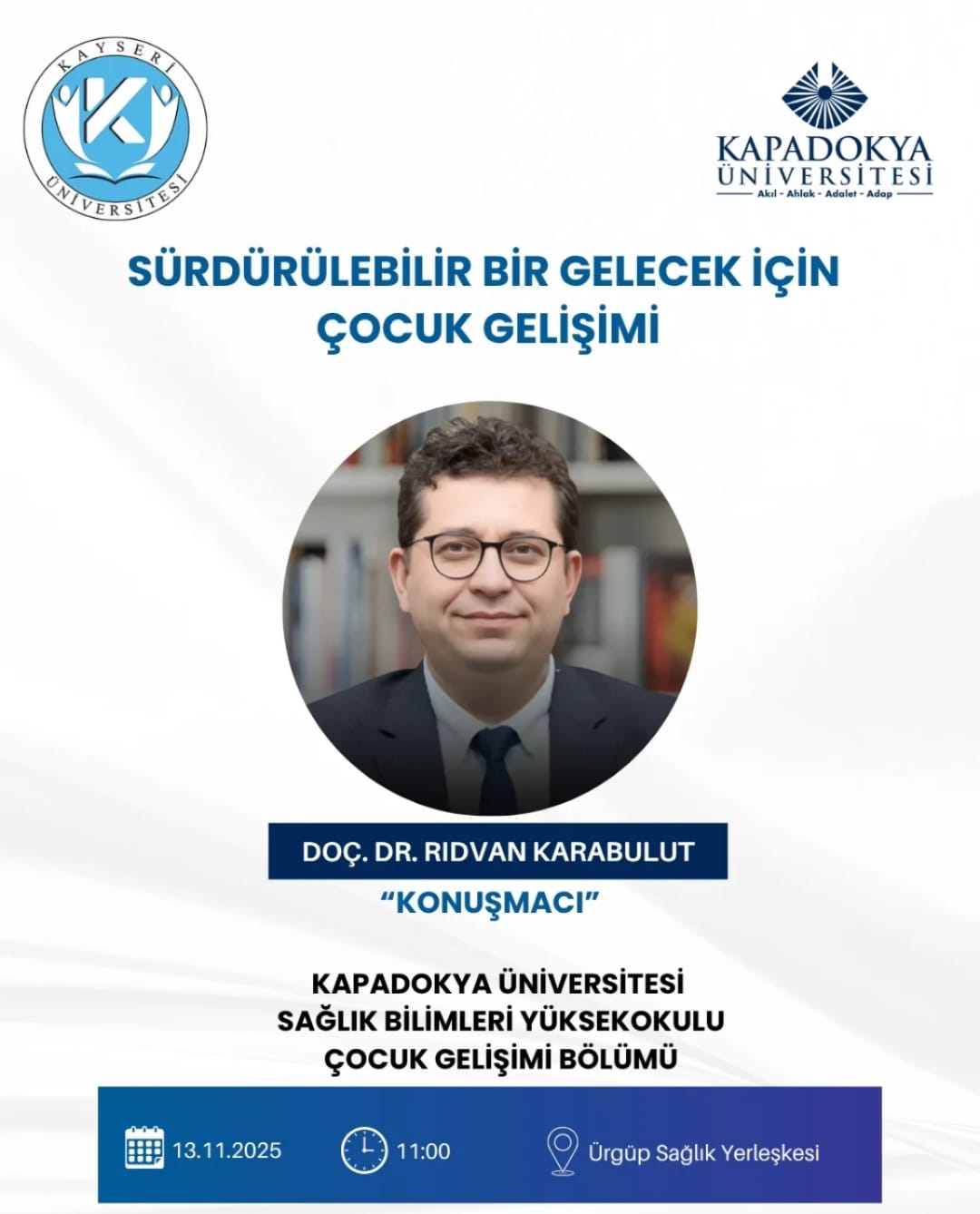 Fakültemiz Çocuk Gelişimi Bölüm Başkanı Doç. Dr. Rıdvan KARABULUT, Kapadokya Üniversitesi Sağlık Bilimleri Yüksekokulu Çocuk Gelişimi Programı öğrencilerine yönelik “Sürdürülebilir Bir Gelecek İçin Çocuk Gelişimi” başlıklı kapsamlı bir konferans verdi.